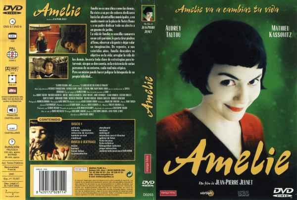 Int.: Audrey Tautou, Mathieu Kassovit, Rufus Magloire, Lorella Cravotte, Serge Merlin, Jamel Debbouze.Resumen: Amelie no es una chica como las demás. Ha visto a su pez de colores deslizarse hacia las alcantarillas municipales, a su madre morir en la plaza de Nôtre-Dame y a su padre dedicar todo su afecto a un gnomo de jardín. De repente, a los veintidós años, descubre su objetivo en la vida: arreglar la vida de los demás. A partir de entonces, inventa toda clase de estrategias para intervenir en los asuntos de los demás: su portera, que se pasa los días bebiendo vino de Oporto; Georgette, una estanquera hipocondríaca, o "el hombre de cristal", un vecino que sólo ve el mundo a través de la reproducción de un cuadro de Renoir.
